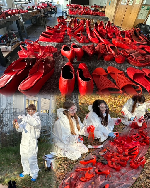 Heute wurde es kreativ auf unserem Schulgelände: Schülerinnen und Schüler der Realschule Heilsbronn sprühten rote Farbe auf alte Frauenschuhe – als Vorbereitung für die Kunstaktion „Zapatos Rojos“. Jedes Paar steht symbolisch für eine Frau, die im Jahr 2024 in Deutschland durch ihren Partner oder Ex-Partner getötet wurde. Die sogenannten Femizide sind ein ernstes gesellschaftliches Problem – auch hierzulande. Mit der Gestaltung der Schuhe möchten wir ein sichtbares Zeichen setzen: gegen Gewalt, für Respekt und Solidarität.