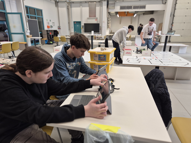 Um überhaupt trainieren zu können, wurden über die Weihnachtsferien eilig Parcours-Kacheln bestellt. Sven und Adrian blieben somit weniger als zwei Monate Zeit zur Vorbereitung. Dass sie sich in diesem kurzen Fenster gegen die überwiegend gymnasiale Konkurrenz durchsetzen konnten, verdanken sie ihren hervorragenden Problemlösestrategien. Ob veränderte Lichtverhältnisse vor Ort oder unerwartete Abweichungen im Parcours – die beiden blieben fokussiert und passten ihren Roboter immer wieder an die Gegebenheiten an.