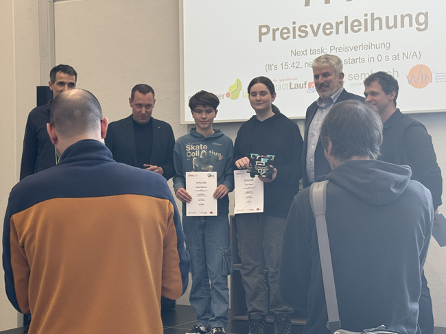 Um überhaupt trainieren zu können, wurden über die Weihnachtsferien eilig Parcours-Kacheln bestellt. Sven und Adrian blieben somit weniger als zwei Monate Zeit zur Vorbereitung. Dass sie sich in diesem kurzen Fenster gegen die überwiegend gymnasiale Konkurrenz durchsetzen konnten, verdanken sie ihren hervorragenden Problemlösestrategien. Ob veränderte Lichtverhältnisse vor Ort oder unerwartete Abweichungen im Parcours – die beiden blieben fokussiert und passten ihren Roboter immer wieder an die Gegebenheiten an.